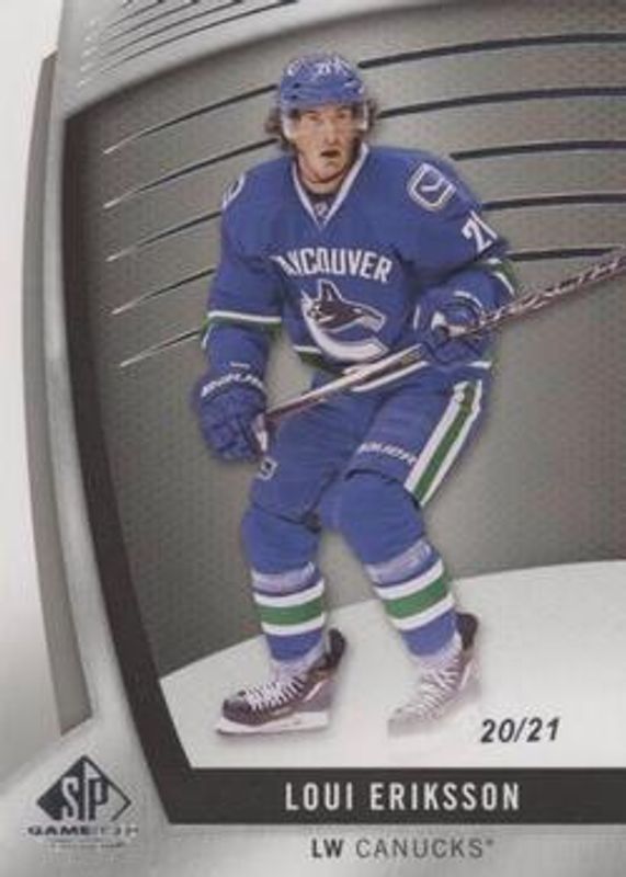 The Loui Eriksson 2017 SP Game Used #30 Base /73 card is 1 of 7 Loui Eriksson's card variations in the 2017 SP Game Used set being tracked by Sports Card Investor, including Gold Jerseys /399, Orange Rainbow /113, Autographs /92, Spectrum Gold Premium Materials /49, and Spectrum Red Autographed Premium Materials /5.
