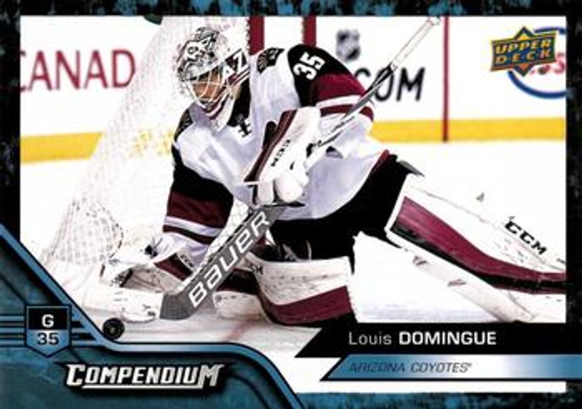 The Louis Domingue 2016 Upper Deck Compendium #16 Blue card is 1 of 7 Louis Domingue's card variations in the 2016 Upper Deck Compendium set being tracked by Sports Card Investor, including Gold, Red, Printing Plates Black /1, Printing Plates Cyan /1, and Printing Plates Magenta /1.