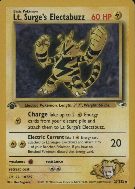 The Lt. Surge's Electabuzz 2000 Gym Heroes #027/132 1st Edition card in Raw TCG (Near Mint) condition has moved down -$1.79 (-9.0%) in the last 30 days and was last sold for $18.20 .