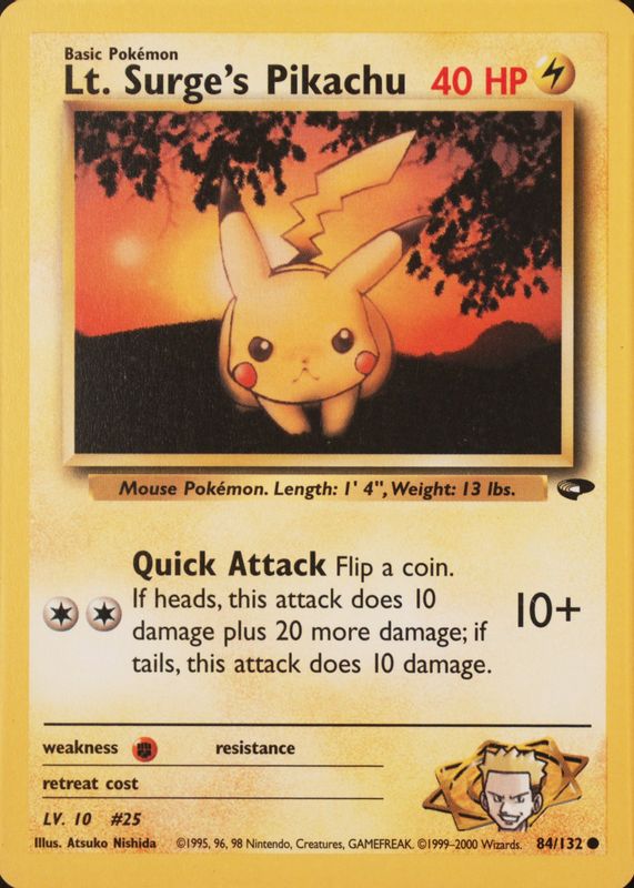 The Lt. Surge's Pikachu 2000 Gym Challenge #084/132 Unlimited card in Raw TCG (Near Mint) condition has moved up $0.67 (+10.1%) in the last 30 days and was last sold for $7.30 .