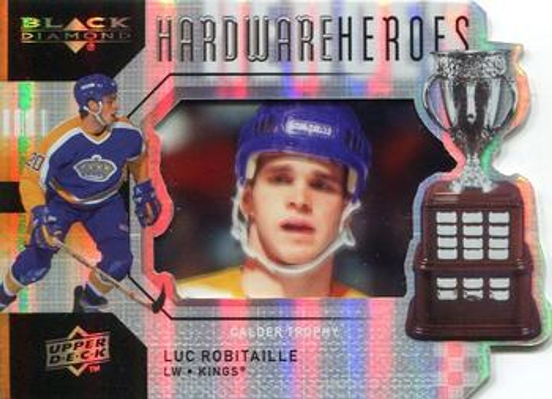 The Luc Robitaille 2009 Upper Deck Black Diamond #HH5 Hardware Heroes /100 card is 1 of 5 Luc Robitaille's card variations in the 2009 Upper Deck Black Diamond set being tracked by Sports Card Investor, including Base, Ruby /100, Gold /10, and Onyx /1.