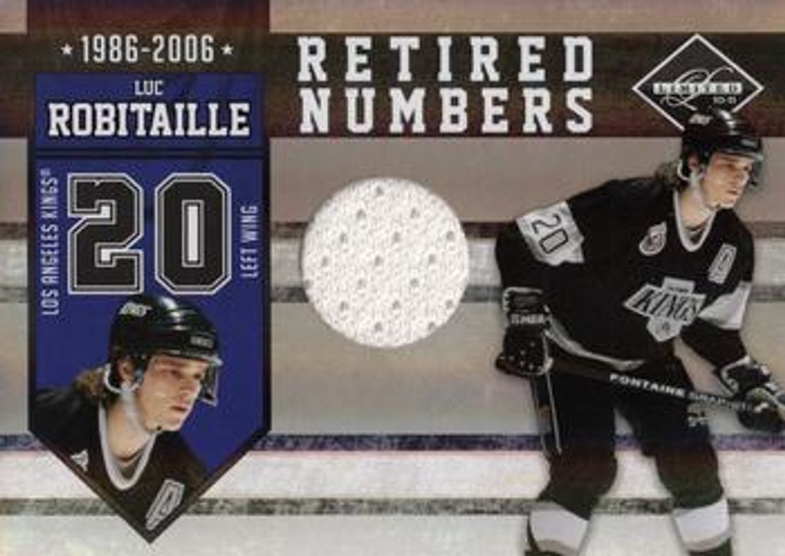 The Luc Robitaille 2010 Limited #17 Retired Numbers Materials /99 card is 1 of 17 Luc Robitaille's card variations in the 2010 Limited set being tracked by Sports Card Investor, including Base /299, Silver Spotlight /50, Gold Spotlight /10, Platinum Spotlight /1, and Retired Numbers Materials Prime.