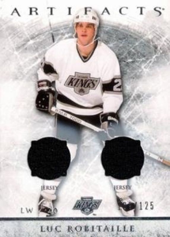 The Luc Robitaille 2012 Upper Deck Artifacts #51 Jersey Jersey /125 card is 1 of 17 Luc Robitaille's card variations in the 2012 Upper Deck Artifacts set being tracked by Sports Card Investor, including Base /699, Emerald /99, Sapphire /85, Gold Spectrum /25, and Black /5.