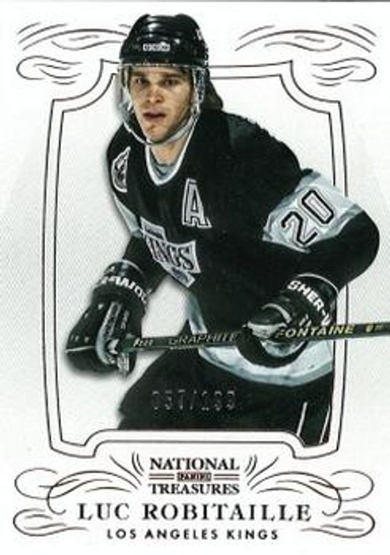 The Luc Robitaille 2013 National Treasures #20 Base /99 card is 1 of 30 Luc Robitaille's card variations in the 2013 National Treasures set being tracked by Sports Card Investor, including Gold /25, Silver /25, Emerald /5, Black /1, and Printing Plates Black /1.