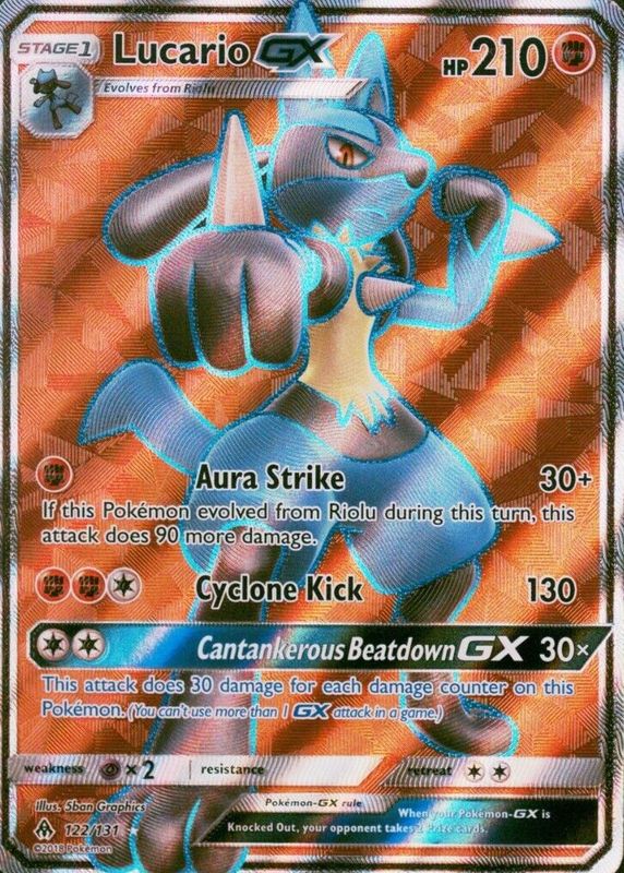 The Lucario GX 2018 Sun & Moon: Forbidden Light #122/131 Holo (Full Art) card in Raw TCG (Near Mint) condition has moved up $1.25 (+5.3%) in the last 30 days and was last sold for $25.00 .
