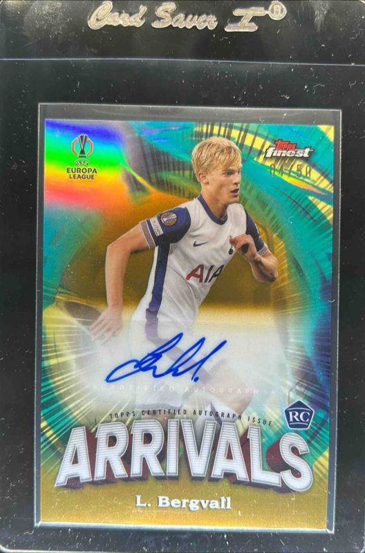 The Lucas Bergvall 2024 Topps Finest UEFA Club Competitions #AA-LB Arrivals Autographs - Gold Refractor /50 Rookie card is 1 of 52 Lucas Bergvall's card variations in the 2024 Topps Finest UEFA Club Competitions set being tracked by Sports Card Investor, including Base, Refractor, Purple Refractor /299, Sky Blue Refractor /275, and Pink RayWave Refractor /250.