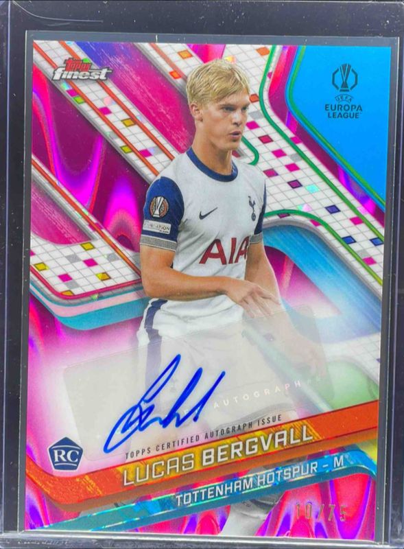 The Lucas Bergvall 2024 Topps Finest UEFA Club Competitions #BA-LB Base Autographs - Magenta Wave Refractor /75 Rookie card is 1 of 52 Lucas Bergvall's card variations in the 2024 Topps Finest UEFA Club Competitions set being tracked by Sports Card Investor, including Base, Refractor, Purple Refractor /299, Sky Blue Refractor /275, and Pink RayWave Refractor /250.