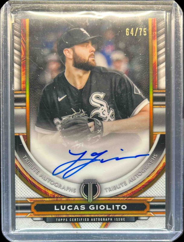 The Lucas Giolito 2023 Topps Tribute #TA-LG Autographs - Gold /75 card is 1 of 12 Lucas Giolito's card variations in the 2023 Topps Tribute set being tracked by Sports Card Investor, including Autographs /199, Autographs - Blue /150, Autographs - Green /99, Autographs - Purple /50, and Autographs - Orange /25.