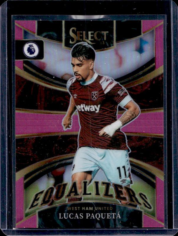 The Lucas Paqueta 2022 Select Premier League #8 Equalizers Pink /25 card is 1 of 63 Lucas Paqueta's card variations in the 2022 Select Premier League set being tracked by Sports Card Investor, including #95 Base, #218 Base, #95 Blue, #218 Blue, and #218 Checkerboard.