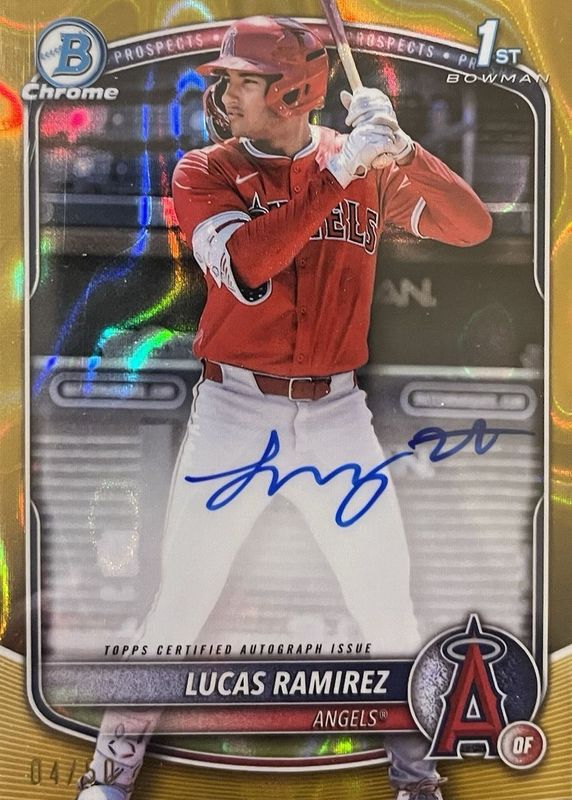 The Lucas Ramirez 2025 Bowman #CPA-LR Chrome Prospect Auto - Gold Lava Refractor /50 (1st) card in Raw condition has not changed in price in the last 30 days and was last sold for $118.50 .