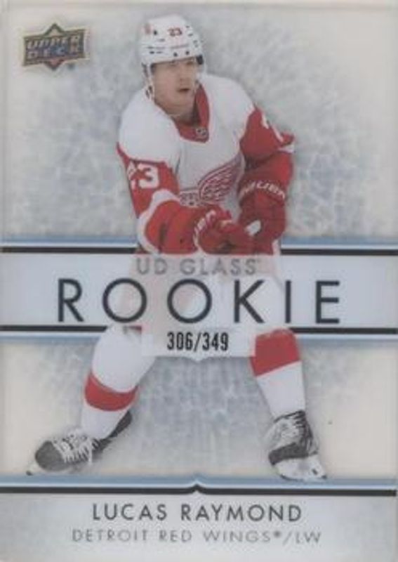 The Lucas Raymond 2021 Upper Deck Ovation #GR-1 UD Glass Rookies /349 card is 1 of 48 Lucas Raymond's card variations in the 2021 Upper Deck Ovation set being tracked by Sports Card Investor, including Base, Checkerboard, Gold Circular Wonder, Gold Foil, and Silver Foil.