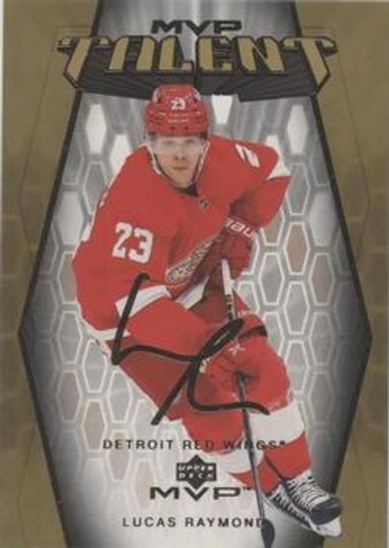 The Lucas Raymond 2023 Upper Deck MVP #MT-96 20th Anniversary - Gold Script card is 1 of 17 Lucas Raymond's card variations in the 2023 Upper Deck MVP set being tracked by Sports Card Investor, including Base, Gold Script, Ice Battles, Silver Script, and Super Script /25.