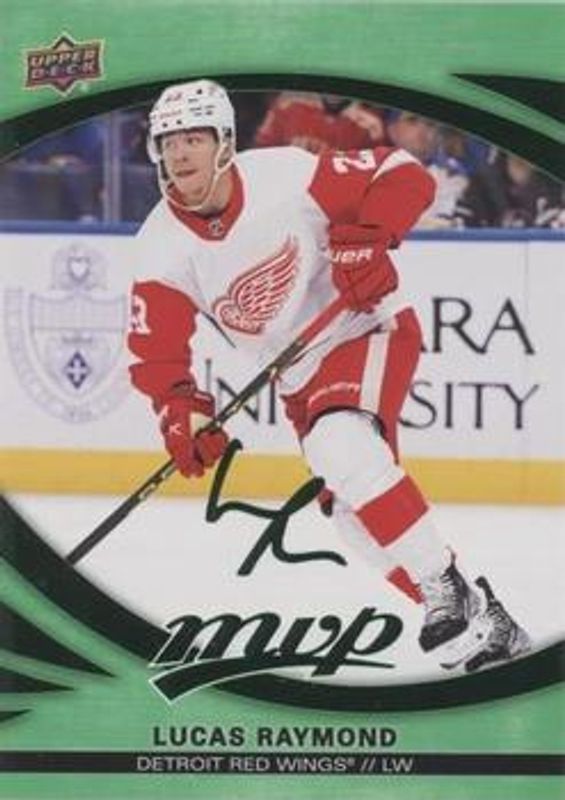 The Lucas Raymond 2023 Upper Deck MVP #114 Green Script card is 1 of 17 Lucas Raymond's card variations in the 2023 Upper Deck MVP set being tracked by Sports Card Investor, including Base, Gold Script, Ice Battles, Silver Script, and Super Script /25.