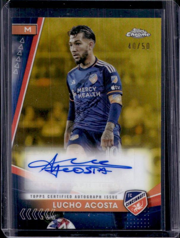 The Lucho Acosta 2024 Topps Chrome MLS #CA-LA Chrome Autographs - Gold Refractor /50 card is 1 of 66 Lucho Acosta's card variations in the 2024 Topps Chrome MLS set being tracked by Sports Card Investor, including #1b Base, #1 Base, #1 Aqua Lava Refractor, #1 Gold Lava Refractor, and #1 Neon Green Lava Refractor.