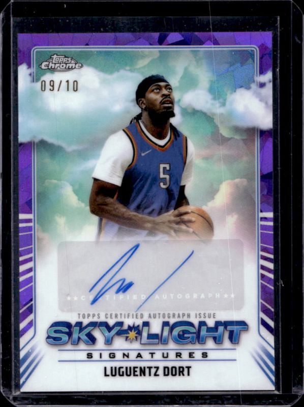 The Luguentz Dort 2024 Topps Chrome Sapphire Edition #SLS-LD Sky-Light Signatures - Purple /10 card is 1 of 12 Luguentz Dort's card variations in the 2024 Topps Chrome Sapphire Edition set being tracked by Sports Card Investor, including Base, Green /99, Gold /50, Orange /25, and Purple /10.