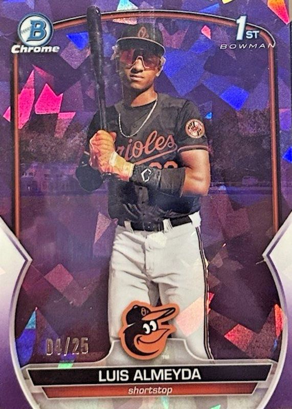 This card is 1 of 7 Luis Almeyda's card variations in the 2023 Bowman Chrome Sapphire Edition set being tracked by Sports Card Investor, including Prospects (1st), Prospects - Aqua /99 (1st), Prospects - Orange /75 (1st), Prospects - Yellow /50 (1st), and Prospects - Red /5 (1st).
