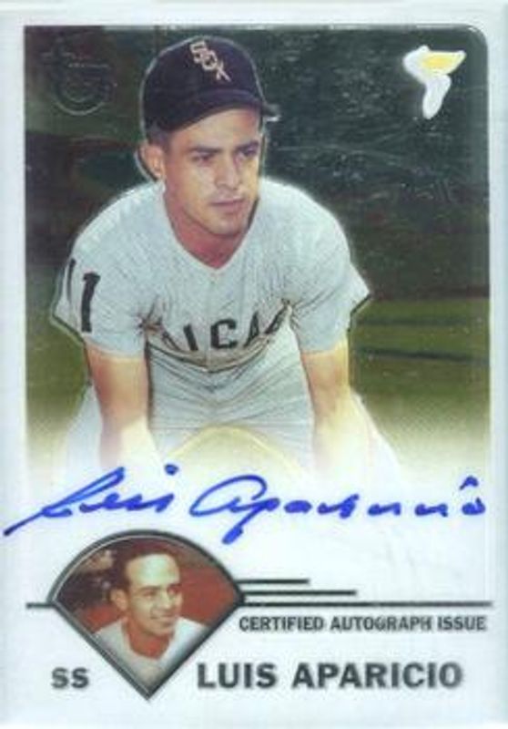 The Luis Aparicio 2003 Topps Retired Signature Edition #TA-LA Autographs card is 1 of 4 Luis Aparicio's card variations in the 2003 Topps Retired Signature Edition set being tracked by Sports Card Investor, including Base, Black /99, and Autographs - Refractor /25.
