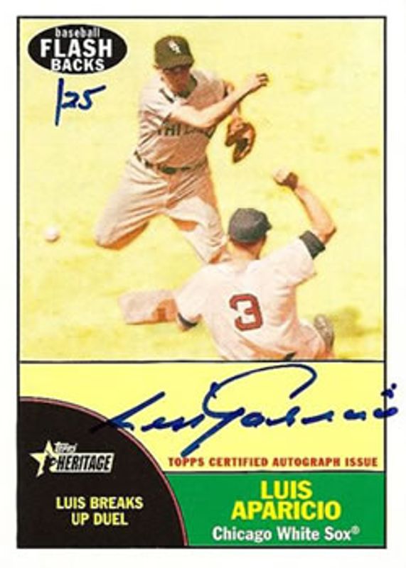 The Luis Aparicio 2010 Topps Heritage #LA Baseball Flashback Autographs /25 card is 1 of 11 Luis Aparicio's card variations in the 2010 Topps Heritage set being tracked by Sports Card Investor, including 50th Anniversary Buybacks, Baseball Flashbacks, Baseball Flashback Stadium Relics, Framed Buyback Stamps, and Real One Autographs.
