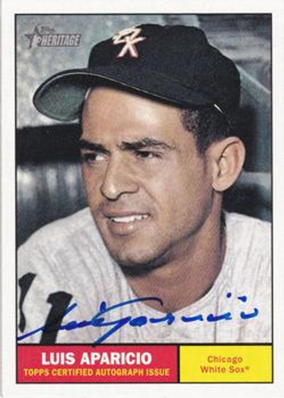 The Luis Aparicio 2010 Topps Heritage #ROALA Real One Autographs card is 1 of 11 Luis Aparicio's card variations in the 2010 Topps Heritage set being tracked by Sports Card Investor, including 50th Anniversary Buybacks, Baseball Flashbacks, Baseball Flashback Stadium Relics, Framed Buyback Stamps, and Real One Autographs.