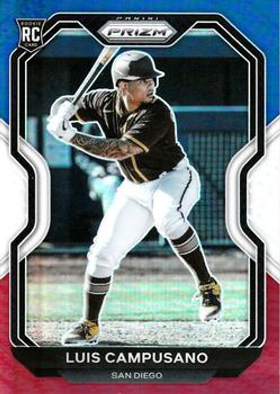 The Luis Campusano 2021 Prizm #8 Red White Blue Rookie card is 1 of 68 Luis Campusano's card variations in the 2021 Prizm set being tracked by Sports Card Investor, including Base, Blue, Blue Velocity, Carolina Blue, and Cosmic Haze.