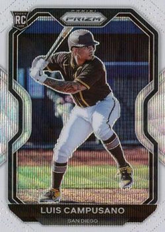 The Luis Campusano 2021 Prizm #8 White Wave Rookie card is 1 of 68 Luis Campusano's card variations in the 2021 Prizm set being tracked by Sports Card Investor, including Base, Blue, Blue Velocity, Carolina Blue, and Cosmic Haze.