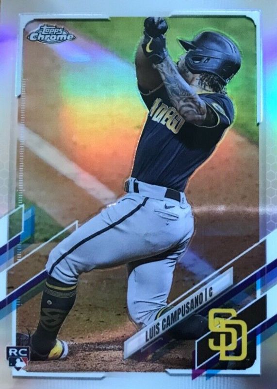 This card is 1 of 5 Luis Campusano's card variations in the 2021 Topps Chrome set being tracked by Sports Card Investor, including Prism Refractor, Sepia Refractor, X-Fractor, and Gold Refractor /50.