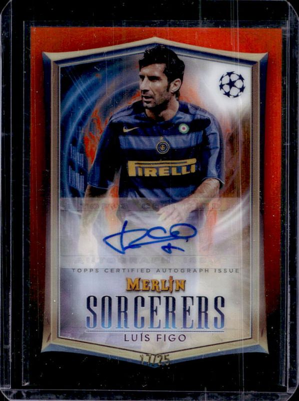 The Luis Figo 2022 Topps Merlin Chrome UEFA Club Competitions #SA-LF Sorcerers Autographs - Orange Refractor /25 card is 1 of 11 Luis Figo's card variations in the 2022 Topps Merlin Chrome UEFA Club Competitions set being tracked by Sports Card Investor, including Ageless Alchemy, Sorcerers Autographs, Ageless Alchemy - Blue Refractor /75, Ageless Alchemy - Gold Refractor /50, and Sorcerers Autographs - Gold Refractor /50.