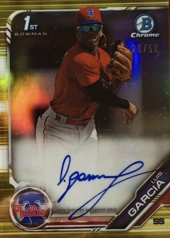 Best Prices Available For Sale of Luis Garcia (Phillies) 2019 Bowman Chrome #CPA-LG Prospect Auto - Gold Refractor /50 (1st)