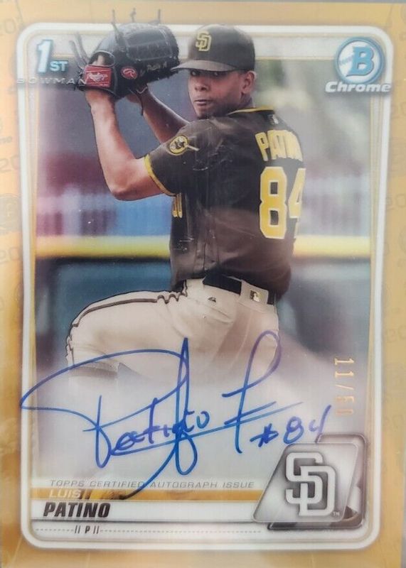 The Luis Patino 2020 Bowman #CPA-LP Chrome Prospect Auto - Gold Refractor /50 (1st) card in Raw condition has not changed in price in the last 30 days and was last sold for $52.00 .