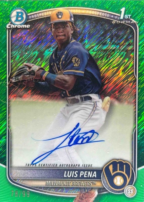 2025 1st Bowman Chrome Luis Pena Green Shimmer On Card Auto 81/99 Brewers RC SP