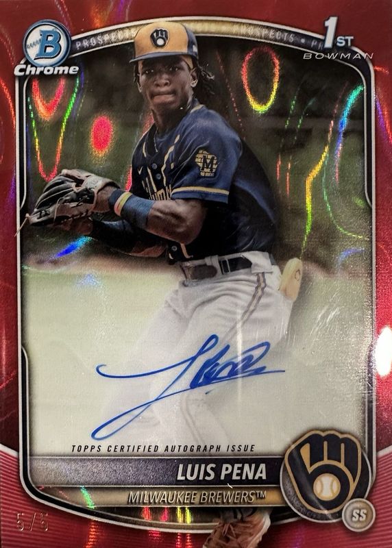 The Luis Pena 2025 Bowman #CPA-LP Chrome Prospect Auto - Red Lava Refractor /5 (1st) card in Raw condition has not changed in price in the last 30 days and was last sold for $3,899.99 .