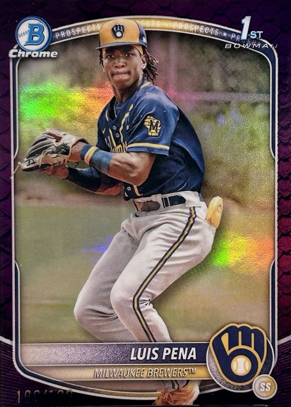 This card is 1 of 108 Luis Pena's card variations in the 2025 Bowman set being tracked by Sports Card Investor, including Chrome Prospects (1st), Prospects (1st), Chrome Prospects - Gumball Refractor (1st), Chrome Prospects - Mini Diamond Refractor (1st), and Chrome Prospects - Peanuts Refractor (1st).