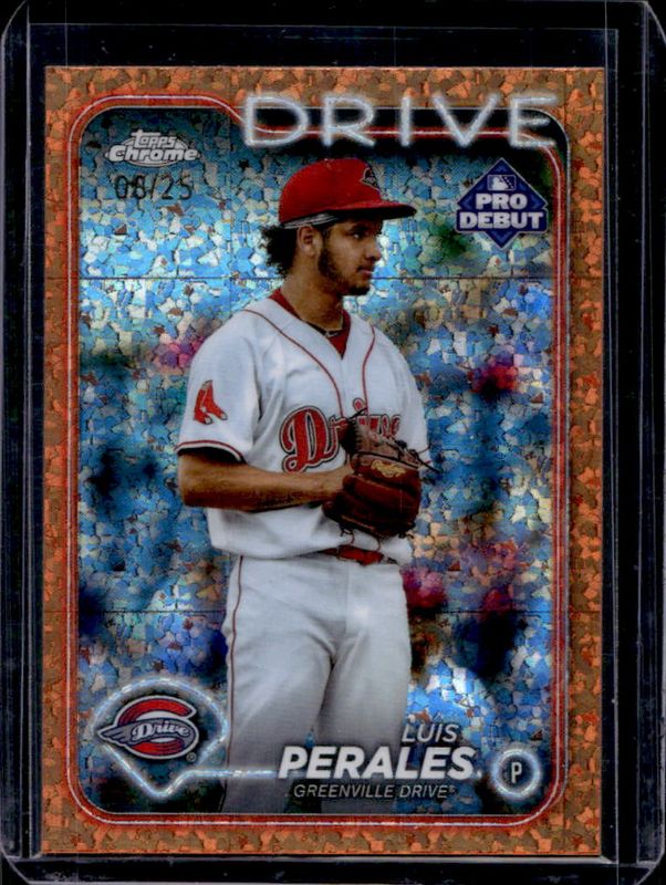 The Luis Perales 2024 Topps Pro Debut #PDC-43 Chrome - Orange Mini-Diamond Refractor /25 card is 1 of 37 Luis Perales' card variations in the 2024 Topps Pro Debut set being tracked by Sports Card Investor, including Base, Fuchsia Foil /199, Sparkle Foil /175, Blue Foil /150, and Green Foil /99.