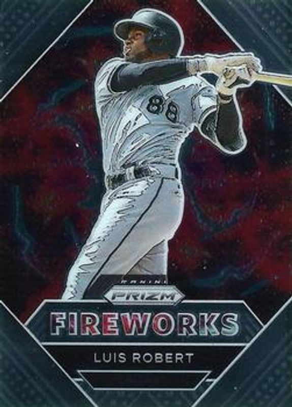 The Luis Robert Jr. 2021 Prizm #FW1 Fireworks card is 1 of 95 Luis Robert Jr.'s card variations in the 2021 Prizm set being tracked by Sports Card Investor, including Base, Blue, Blue Velocity, Carolina Blue, and Cosmic Haze.