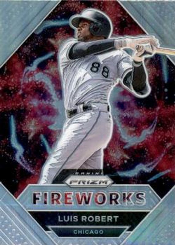 The Luis Robert Jr. 2021 Prizm #FW1 Fireworks - Silver card is 1 of 95 Luis Robert Jr.'s card variations in the 2021 Prizm set being tracked by Sports Card Investor, including Base, Blue, Blue Velocity, Carolina Blue, and Cosmic Haze.