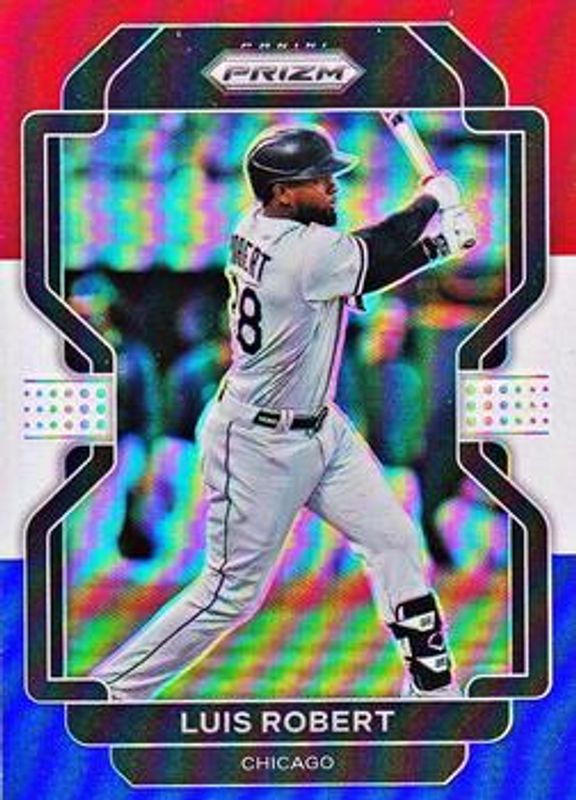 The Luis Robert Jr. 2022 Prizm #196 Red White Blue card is 1 of 82 Luis Robert Jr.'s card variations in the 2022 Prizm set being tracked by Sports Card Investor, including Base, Blue, Blue Velocity, Carolina Blue, and Cosmic Haze.