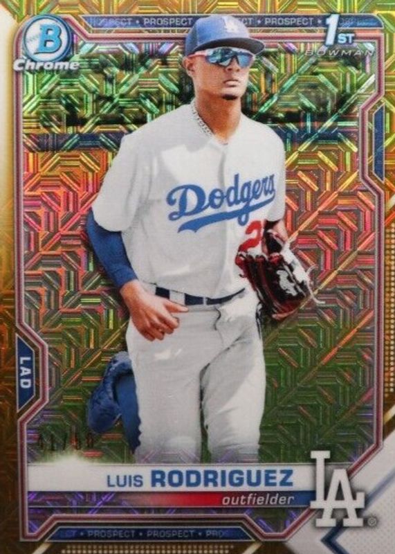 This card is 1 of 24 Luis Rodriguez's card variations in the 2021 Bowman Chrome set being tracked by Sports Card Investor, including Prospects (1st), Prospects - Black & White Mini-Diamond Refractor (1st), Prospects - Shimmer Refractor (1st), Prospects - Refractor /499 (1st), and Prospects - Speckle Refractor /299 (1st).