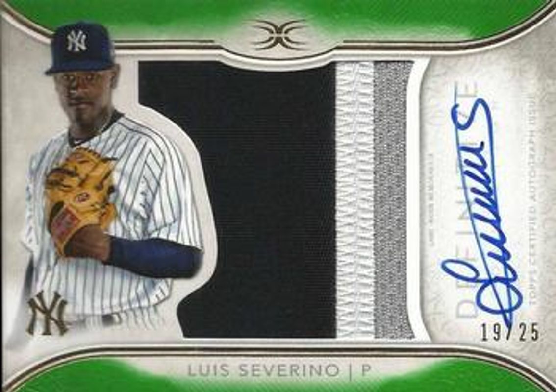 The Luis Severino 2018 Topps Definitive Collection #ARC-LS Green /25 card is 1 of 13 Luis Severino's card variations in the 2018 Topps Definitive Collection set being tracked by Sports Card Investor, including Base /30, Purple /10, Red Button /1, Red Majestic Logo /1, and Red MLB Logo /1.