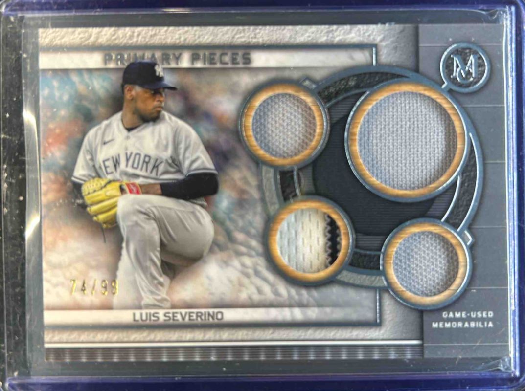 The Luis Severino 2023 Topps Museum Collection #SPPPQR-LS Single Player Primary Pieces Quad Relics /99 card is 1 of 16 Luis Severino's card variations in the 2023 Topps Museum Collection set being tracked by Sports Card Investor, including Single Player Primary Pieces Quad Relics - Copper /75, Meaningful Materials Relics /50, Meaningful Materials Relics - Copper /35, Meaningful Materials Relics - Gold /25, and Single Player Primary Pieces Quad Relics - Gold /25.