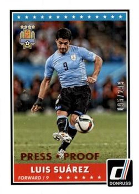 The Luis Suarez 2015 Donruss #70b Bronze Press Proof /299 card is 1 of 24 Luis Suarez's card variations in the 2015 Donruss set being tracked by Sports Card Investor, including #70 Base, #70b Base, #70 Bronze Press Proof /299, #70b Silver Press Proof /199, and #70 Silver Press Proof /199.
