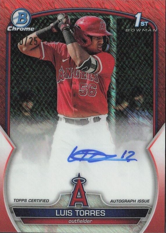 This card is 1 of 20 Luis Torres' card variations in the 2023 Bowman Chrome set being tracked by Sports Card Investor, including Prospect Auto (1st), Prospect Auto - Refractor /499 (1st), Prospect Auto - Speckle Refractor /299 (1st), Prospect Auto - Purple Refractor /250 (1st), and Prospect Auto - Blue RayWave Refractor /150 (1st).