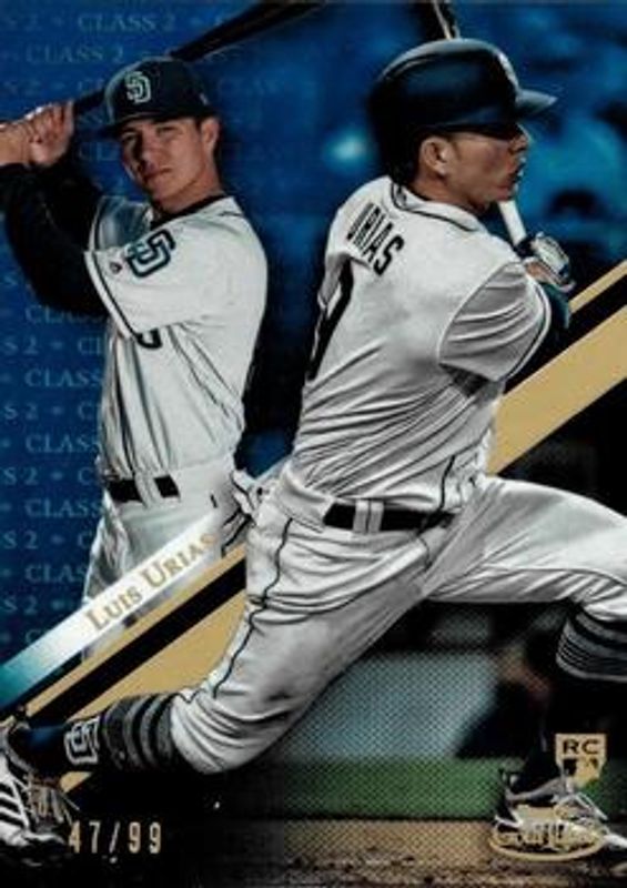 The Luis Urias 2019 Topps Gold Label #70 Class 2 Blue /99 Rookie card is 1 of 22 Luis Urias' card variations in the 2019 Topps Gold Label set being tracked by Sports Card Investor, including Base, Class 2, Class 3, Class 1 Black, and Class 2 Black.