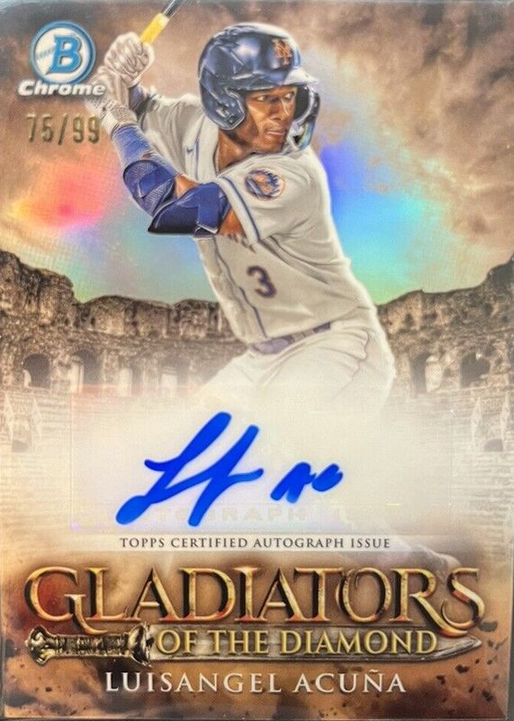 This card is 1 of 16 Luisangel Acuna's card variations in the 2024 Bowman set being tracked by Sports Card Investor, including Gladiators of the Diamond, Gladiators of the Diamond - Mini-Diamond Refractor /150, Bowman Scouts' Top 100 Autographs /99, Bowman Scouts' Top 100 Autographs - Gold Refractor /50, and Gladiators of the Diamond Autographs - Gold Refractor /50.