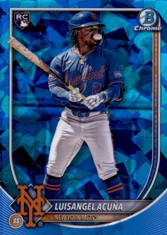 This card is 1 of 18 Luisangel Acuna's card variations in the 2025 Bowman Chrome Sapphire Edition set being tracked by Sports Card Investor, including Base, Green Refractor /99, Yellow /75, Gold /50, and Image Variation - Gold /50.
