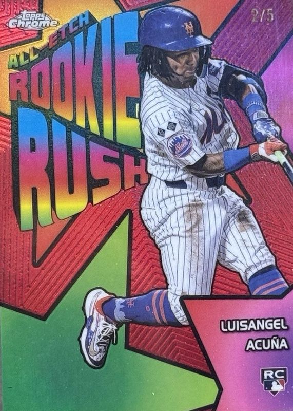The Luisangel Acuna 2025 Topps Chrome #CERR-11 All-Etch Rookie Rush - Red Refractor /5 card in Raw condition has not changed in price in the last 30 days and was last sold for $80.00 .
