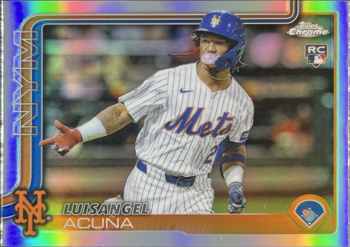 The Luisangel Acuna 2025 Topps Chrome #56 Base Image Variation Rookie card is 1 of 143 Luisangel Acuna's card variations in the 2025 Topps Chrome set being tracked by Sports Card Investor, including Base, Geometric Refractor, Image Variation, Lightboard Logo Variation, and Negative Refractor.