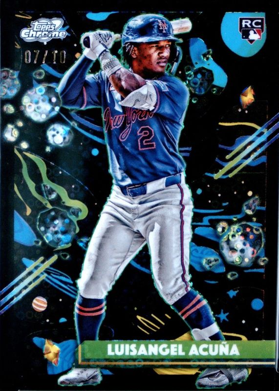 This card is 1 of 63 Luisangel Acuna's card variations in the 2025 Topps Chrome Cosmic set being tracked by Sports Card Investor, including Base, Nucleus Refractor, Refractor, Aqua Equinox Refractor /199, and Purple Nebula Refractor /150.