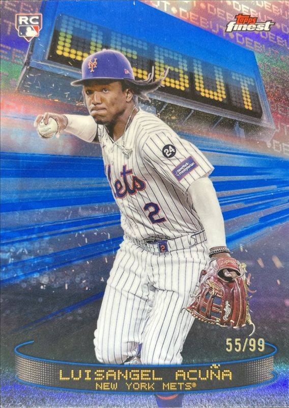 The Luisangel Acuna 2025 Topps Finest #D-20 Debut - Blue Refractor /99 Rookie card is 1 of 164 Luisangel Acuna's card variations in the 2025 Topps Finest set being tracked by Sports Card Investor, including Common, Rare, Uncommon, Common - Checkerboard Refractor, and Common - Refractor.