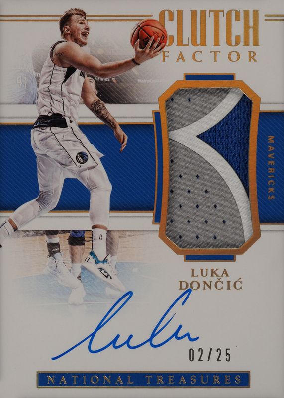 The Luka Doncic 2018 National Treasures #CF-LDC Clutch Factor Signatures - Prime (/25) Rookie card in Raw condition has not changed in price in the last 30 days and was last sold for $710.00 .