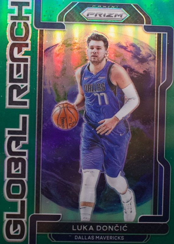The Luka Doncic 2021 Prizm #4 Global Reach - Green card in Raw condition has moved up $1.01 (+102%) in the last 30 days and was last sold for $2.00 .